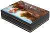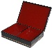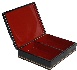 The box is constructed out of paper-mache. Black lacquer covers the exterior and red lacquer covers the interior of the box. The interior is separated into two departments. The box has a hinge from the top of the scene, and rests on a flat bottom. The work is signed with the artist's name.