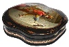 The box is constructed from paper-mache. Black lacquer is used to paint the exterior of the box while red lacquer completes the interior of the work. The exterior is decorated with rich gold ornaments. A hinge is fastened to the top of the portrait, and the box rests on a flat bottom. The work is signed with the artist's name, Fedoskino and the year of 2010.