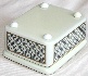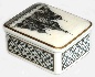 Rogatov has painted the architecture of the cathedral in dark grey tones of oils against the cream background. Cream tone has been also chosen to cover the box's exterior while the interior is traditionally covered with red lacquer. The box's sides are decorated with elegant tartan patterns painted in dark grey and green oils and outlined with gold. Gold is also used to decorate the edges of the box.