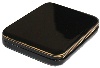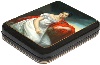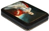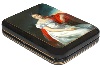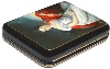 The box is constructed from paper-mache. Black lacquer is used to paint the exterior of the piece while red lacquer completes the interior of the box. The portrait is framed with a gold line. Two parallel gold lines decorate the box's sides. The lid is hinged from the left side of the portrait, and the box rests on a flat bottom. The work is signed by the artist's name, the year of 2010 and the village of Fedoskino.