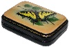 Description: This elegant box is a creation of M.N. Medvedeva from the village of Fedoskino. Butterflies and flowers is the favorite theme of this talented artist and in this work she again returns to this subject. The box depicts beautiful yellow and black butterfly sitting on the tree. Gold metal powder shines through the background and creates a magic effect.