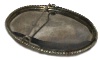 The oval pearl plate on which the portrait is painted is set into the frame made out of German silver. The portrait is framed with swirling metal patterns. The work is signed with the artist's name, Fedoskino and the year of 2010.