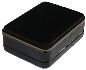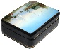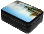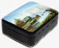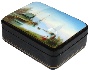 The landscape is painted in the realistic style using blue, green and brown tones of oils. A gold line is used to frame the depicted scene while the box's sides are decorated with two parallel gold lines.