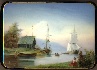 Description: This peaceful river landscape is a creation of Ilya Buzovkin from the village of Fedoskino. It is early morning and fishermen are ready to start their working day. They leave the riverbank on board of their sailing boats and boats. Someone's wife has come to see her husband off. She sits on the riverbank and nurses her little child.