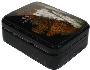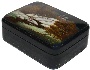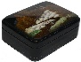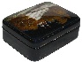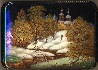 Description: Pavel Sladkov from the village of Fedoskino is the author of this beautiful scene. Here he has managed to express an exciting moment in nature when the first snow has fallen on the ground. The trees are still covered with fiery orange foliage that contrasts dramatically with the fresh white snow. This contrast is strengthened by the brilliant gold paint that is used to highlight the foliage of the trees and its reflection on the water.