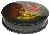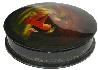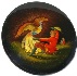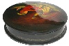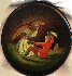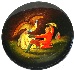 Description: This round shaped box has been created by Kozlova from the village of Fedoskino. It shows a recognizable fragment from the Russian folk fairy-tale "Ivan Tsarevich and the Grey Wolf". Here we can see Ivan Tsarevich who tries to catch the magic Firebird.