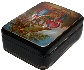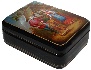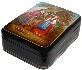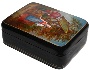 The box is constructed from paper-mache. Black lacquer covers the exterior and red lacquer covers the interior of the box. The composition is framed with a gold line; the sides of the box are decorated with two gold parallel lines. A hinge is fastened to the left of the composition. The box rests on a flat bottom. It is signed with the name of the artist, village and year (2010).