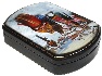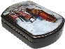 The box is made out of paper-mache. Black lacquer covers the exterior and red lacquer covers the interior of the box. The scene is framed with a wavy gold line. The lid is hinged from the left of the scene, and the box rests on a flat bottom. The work is signed with the artist's name, Fedoskino, and the year of 2010.