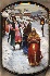 Light blue and grey tones of oils suitable for depiction of a winter scene predominate here. This rather monotonous palette is enlivened by brilliant gold metal leaf inlay that decorates the costumes of the characters and creates a light source inside the icon. Silver powder is used highlight the costume of the young man.