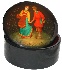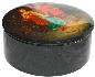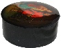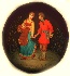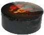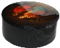 Description: This large round-shaped box is a creation of S. Dzibuk from the village of Fedoskino. It shows the rendezvous of a pretty peasant girl with a lad. The characters are painted in bright oil paints against the brown background. Gold metal leaf inlay is used to create a sparkle of the girl's basket and the lad's apple as well as to decorate the costumes of the characters with shimmering patterns. Gold metal powder is mixed into the oils to enhance color of the girl's skirt and the lad's collar and belt.