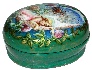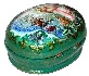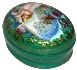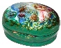 The box's exterior is beautifully decorated. Gold powder covers green surface of the box's exterior forming an attractive pattern. The box's interior is covered with red lacquer.
