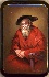 The old man's figure is painted against the dark brown background that tones with his dark red clothes.