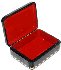 The box is constructed out of paper-mache. Black lacquer covers the exterior and red lacquer covers the interior of the box. The box has a hinge from the top of the scene, and rests on a flat bottom. Signed with the artist's name.