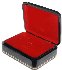 The box is constructed out of paper-mache. Black lacquer covers the exterior and red lacquer covers the interior of the box. The box has a hinge from the top of the box, and rests on a flat bottom. Signed with the artist's name.