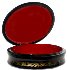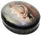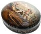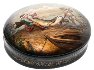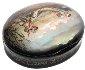 The box is constructed from paper-mache. The lid is hinged from the top of the composition, and the box rests on a flat bottom. The work is signed with the artist's name.