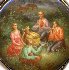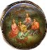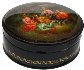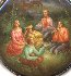 Description: This round shaped box has been created by famous artist Sergey Chistov from the village of Fedoskino. It depicts a group of shepherds sitting on the meadow at night and amusing themselves with singing songs. On the background we can see several horses. The fog is coming to a meadow...
