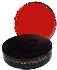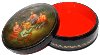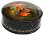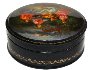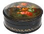 The box is constructed from paper-mache. Black lacquer is used to paint the exterior of the box while red lacquer completes the interior of the work. The exterior is decorated with elegant gold ornaments. The lid isn't hinged, and the box rests on a flat bottom. The work is signed with the artist's name, the year of 2003 and the village of Fedoskino.