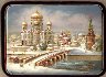 Description: Mikhail Tugarinov from the village of Fedoskino created a glorious sight of the Temple of Christ the Savior. This magnificent building is located in the center of Moscow, not far from the Kremlin. It was constructed on a vow given by sovereign Alexander I in gratitude for saving fatherland "from the Gauls invasion". On September 10, 1839 the solemn laying of the present temple in Russian-Byzantian style took place. It was constructed under the project of architect K.A. Ton, at the expense of the Treasury with attraction of people's donations. The temple was consecrated on April 10, 1883 during the days of crowning of the emperor Nikolay I. Architect K.Ton realized the project of a five-domed temple with a big central and four angular turrets with 14 bells. The banners and keys of the conquered cities were transferred to the temple. First electric street lamps in Moscow appeared on the square in front of the temple. The height of the temple was 103 m. On December 5, 1931 the temple was blown up. Subsequently the foundation ditch was used for the construction of swimming - pool " Moscow ". In 1994 the pool was closed. On January 1995, the solemn laying of the revived temple took place. Now the temple has an active museum where excursions are held and the viewing platform is arranged.