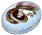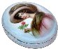 Description: This elegant box has been painted by Larisa Olisova. Here she has drawn the portrait of Lady in a Hat.The portrait is drawn against the light blue background. Silver powder shines through the bows that decorate the woman's dress and feathers on a hat.