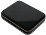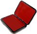 The box is constructed out of paper-mache. Black lacquer covers the exterior and red lacquer covers the interior of the box. The box has a hinge from the top of the scene, and rests on a flat bottom. Signed with the artist's name.