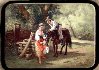 Here the artist depicted watering of a horse. The man is still sit on a horse and a young woman is watering a horse from a buckle.