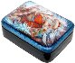 The scene is painted in bright oils and detailed with brilliant gold paint. The box's exterior (except the box's exterior bottom) is decorated with beautiful patterns that resemble frost patterns on the window. These patterns are painted with the help of lustrous silver powder. The box's interior is traditionally covered with red lacquer.