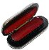 The exterior of the box is painted with black lacquer and the interior is painted with red lacquer. The lid is hinged from the top of the composition and the box rests flat. The box is signed with the artist's name.