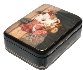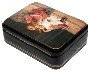 The box is constructed from paper-mache. Black lacquer is used to paint the exterior of the box while red lacquer completes the interior of the work. The scene is framed with a gold line while the box's sides are decorated with two parallel gold lines. The lid is hinged from the top of the scene, and the box rests on a flat bottom. The work is signed with the artist's name, Fedoskino and the year of 2011.