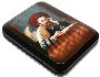 The box is constructed from paper-mache. Black lacquer is used to paint the exterior of the box while red lacquer completes the interior of the work. A hinge is fastened to the left of the portrait, and the box rests on a flat bottom. The work is signed with the artist's name.
