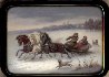 Here the artist depicts a woman returning home from the guests from another village in the sledge. A woman sit in the sledge pulling by a troika of horses, and a coachman is trying to talk to a woman. On the back of the composition we can see beautiful winter landscape and the last houses at the edge of a village. The dogs are following the carriage and barking at it...
