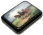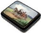 Description: Yevgeniy Potekhin is the author of this traditional Fedoskino box that features a woman riding in the carriage. Clouds are getting heavier and heavier and looks like the rain is coming. The coachman whips the three horses with the reins making them race faster. On the back of the composition we can see beautiful summer landscape and the trees at the edge of a forest.