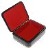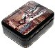 The box is constructed from paper-mache. Black lacquer is used to paint the exterior of the box while red lacquer completes the interior of the work. The lid is hinged from the left of the portrait, and the box rests on a flat bottom. The work is signed with the artist's name.