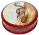 The box is constructed from paper-mache. Dark red lacquer is used to paint the exterior of the box while bright red lacquer completes the interior of the work. The lid isn't hinged and the box rests on a flat bottom. The work is signed with the artist's name and the name of the animal.