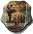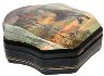 Description: Tatyana Tipyakova of Fedoskino is the accomplished master responsible for the gorgeous artistry in front of you. On the box's lid the artist has expressively painted the beautiful landscape which we can see from an opened window. It is a warm, late Spring evening. It emanates golden rays and makes the sky shimmer with red, orange and yellow tones. The waving river reflects the fire of the skies and glow with red and orange undertones... A nest of storks- like a symbol of the future birth only undertones a peaceful mood!
