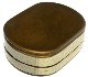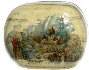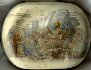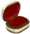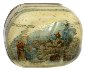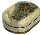 The box is constructed out of paper-mache. Its exterior is of a white creamy tone while its interior is traditionally covered with red lacquer. The lid is hinged from the top of the scene, and the box rests on a flat bottom. The work is signed with the artist's name and Fedoskino .