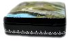 The box is made out of paper-mache. The lid is hinged from the left of the scene, and the box rests on a flat bottom. The work is signed with the artist's name.