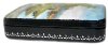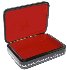 The box's exterior is painted black.The scene is framed with a scan pattern as well as the box's sides are decorated with silver scan patterns. Scan are individual silver punch-outs that are applied to the box during the drying process of the lacquer. The interior of the box is traditionally covered with red lacquer.