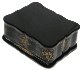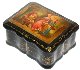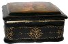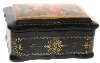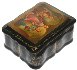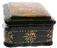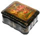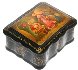 The box is made out of paper-mache. Black lacquer covers the exterior and red lacquer covers the interior of the box. The box has a hinge above the scene and rests on a flat bottom. The Fedoskino factory "troika" logo can be found on the inside of the lid. The box is signed with the name of the artist, village and year (2003).