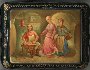 Description: This marvelous box was painted by Fedoskino artist Krasnoslobodtseva Lubov. The box shows two ladies came to a shoe repair workshops, giving a shoe to a worker.