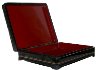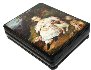 The box is constructed from paper-mache. Black lacquer is used to paint the exterior of the box while red lacquer completes the interior of the work. The lid is hinged from the left of the portrait, and the box rests on four legs. The work is signed with the artist's name and the year of 2012.