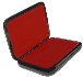 The box is constructed from paper-mache. Black lacquer is used to paint the exterior of the box while red lacquer completes the interior of the work. A hinge is fastened to the left of the composition, and the box rests flat.