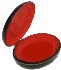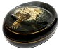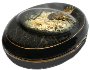 The box is constructed from paper-mache. Black lacquer is used to paint the exterior of the piece while dark red lacquer completes the interior of the work. The lid is hinged from the top of the composition, and the box rests on a platform. The work is signedand dated (1998) by the artist.