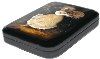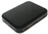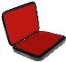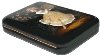 The box is constructed from paper-mache. Black lacquer is used to paint the exterior of the box while red lacquer completes the interior of the work. A hinge is fastened to the left of the composition, and the box rests flat.