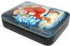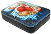 The scene is painted in bright oils and detailed with brilliant gold paint. The box's exterior (except the box's exterior bottom) is decorated with beautiful patterns that resemble frost patterns on the window. These patterns are painted with the help of lustrous silver powder. The box's interior is traditionally covered with red lacquer.