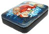 The box is constructed from paper-mache. The lid is hinged from the left of the scene, and the box rests on a flat bottom. The work is signed with the artist's name, the title ("Santa") and the village of Fedoskino.