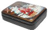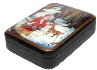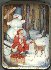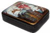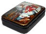 The box is constructed from paper-mache. The lid is hinged from the left of the scene, and the box rests on a flat bottom. The work is signed with the artist's name, the title ("Santa") and the village of Fedoskino.