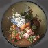 The bouquet is painted in bright oils against the dark brown background that strengthens the colors. A piece of mother-of-pearl is shines through the grapes of the scene.