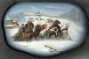 The troika is painted in bright brown and gray oils whereas the surrounding landscape is painted in silver paint that helps to reproduce a shimmer of the snow covered expanses.