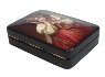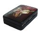 The painting takes up the entire lid of this rectangular piece and has no border. Instead, it seems to fade away to black at the edges. The lid is hinged to the left of the scene and the box has a flat base.
