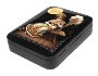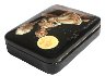 Description: This superior Russian lacquer artistry was created by the talented Oleg Yastrebov of Fedoskino. His ability to depict strikingly decorative compositions is second to none. The work is called "Spinner", and features a girl spinning the yam under a big yellow moon.